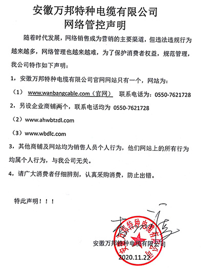 鄭重聲明:安徽萬邦特種電纜有限公司官方網站為:www_wanbangcable_com.hxbvr.cn,除此之外無任何子網站或合作網站,其余均為假冒偽劣。電話:0550-7621728 13485756353 地 址:安徽省天長市滁州高新技術產業開發區經四路29號